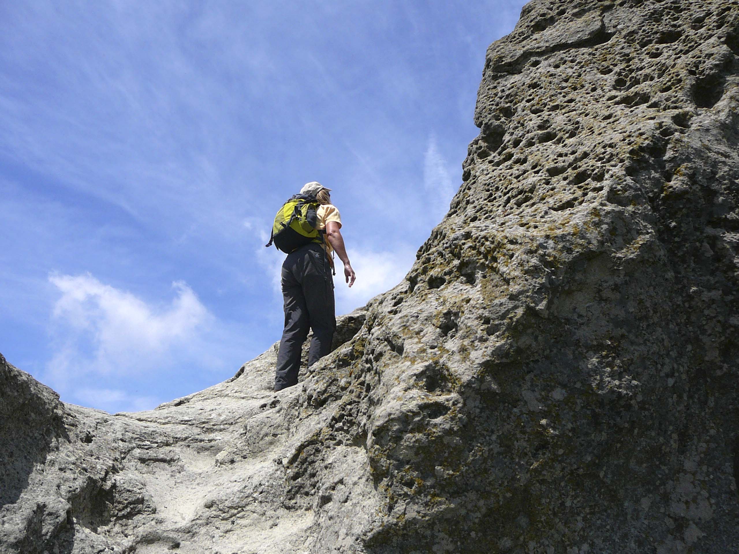 Sie folgen weiterhin dem Weg, der zu einer weiteren Gabelung führt, an der Sie sich rechts halten (WP 9). Wenn Sie an einem der vielen Holzbanken am rechten Wegesrand stehen bleiben und erneut hinab auf die Steilküste (WP 10) blicken, entdecken Sie, dass die massiven Schichten von schmaleren, ockerfarbigen Schichten durchzogen sind. Diese Schichten sind durch Bodenbildung entstanden und deuten darauf hin, dass der Vulkan zwischenzeitlich Ruhephasen von mehreren Jahren gehabt haben muss, in denen es möglich war, eine Art Boden zu bilden. Außerdem deutet die braune Farbe in den mächtigeren Schichten auf einen erhöhten Eisengehalt der Schmelze zum Zeitpunkt der Eruption hin. Die Landzunge die Sie in einiger Entfernung im Süden sehen, nennt sich Punta Pilaro.