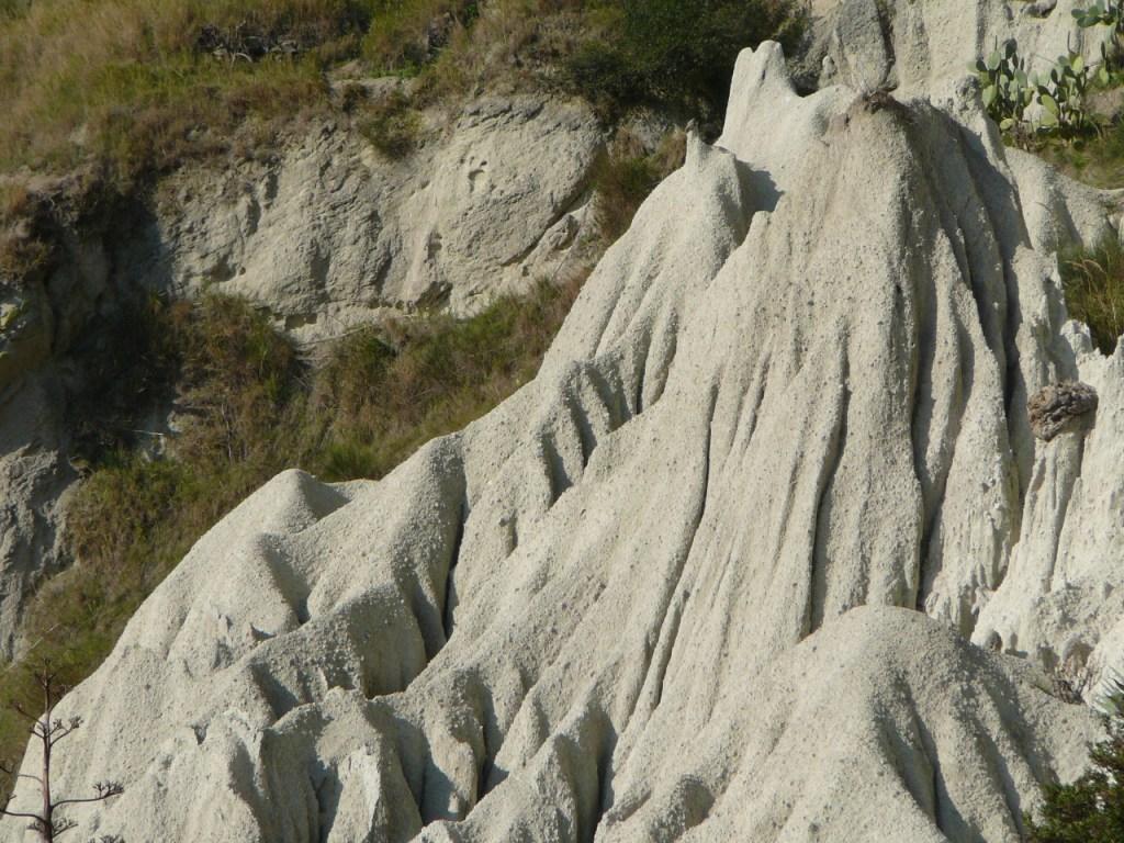 durch fließendes Wasser hervorgerufen werden. Regenwasser kann sich tief in den verwitterungsanfälligen Tuffstein einschneiden. An der Kante der Steilküste bilden sich Erosionsrinnen. Im oberen Bereich sind sie breiter als unten, da die Abtragung an der freiliegenden Kante beginnt. Die Folge ist eine bizarre dreieckige Form. Da die Steilküste im Meer mündet, sind keine Schuttkegel des abgetragenen Materials am Fuße der Steilkante sichtbar.